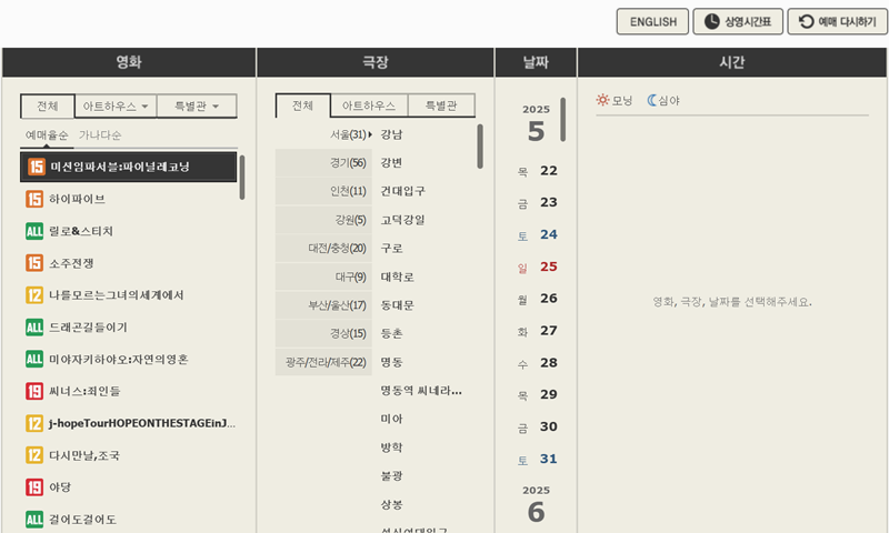 4. 마음에 드는 영화를 찾았다면 예매하기 버튼을 눌러 좌석과 상영 시간을 고르면 돼요. 예매 과정도 어렵지 않아서 원하는 시간과 자리로 바로 예약할 수 있어요. 미리 자리 확인할 수 있어 더 좋아요.
