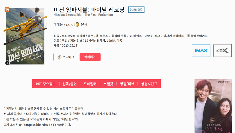 3. 영화 목록에서 보고 싶은 포스터를 고르면 해당 영화의 줄거리, 출연진, 예매율, 관객 평점까지 상세하게 볼 수 있어요. 어떤 영화인지 한눈에 확인할 수 있어서 영화 선택이 훨씬 수월해져요.