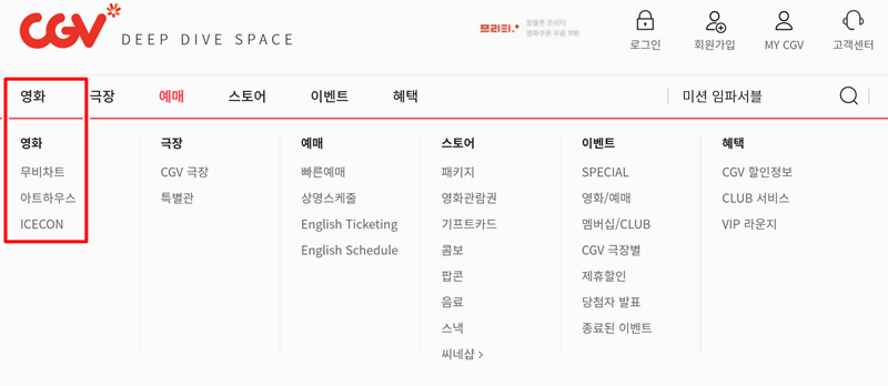 1. 위의 CGV에 들어가면 상단에 여러 메뉴가 보여요. 그중에서 영화 메뉴를 고르면 무비차트라는 목록이 따로 있어요. 여기를 누르면 요즘 어떤 영화가 상영 중인지 바로 확인할 수 있어서 정말 편리해요.