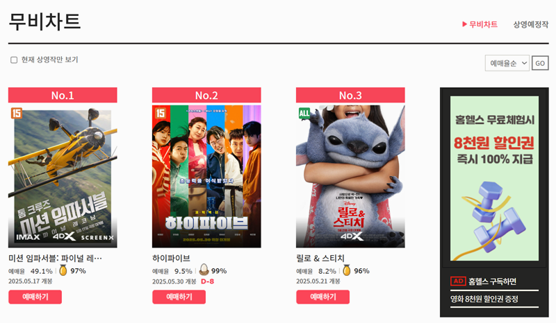 2. 무비차트로 들어가면 지금 극장에서 상영하는 영화들이 쭉 나와 있어요. 한국 영화도 다양하게 준비돼 있고 예매율 높은 순서로 정리돼 있어 고르기 쉬워요. 예매율과 이스터에그 확률 같은 정보도 함께 볼 수 있어요.