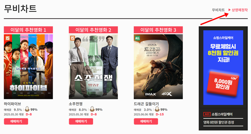 6. 아직 개봉은 안 했지만 기대되는 영화가 궁금하다면 상영예정작 메뉴를 열어보세요. 곧 만날 수 있는 영화들의 정보가 미리 정리돼 있어서 어떤 작품이 나오는지 미리 알 수 있어요.