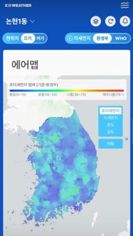 2. 전국에 촘촘히 설치된 측정망 덕분에 사용자 위치의 날씨와 미세먼지, 바람 상태까지 꼼꼼하게 보여줘요. 레이더 영상이나 태풍 경로도 지도로 확인 가능해 쉽게 파악할 수 있습니다.