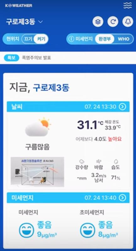 1. 케이웨더 날씨 앱은 전국 3만여 곳에 설치한 기상과 공기질 측정 장비를 활용해요. 전문 예보관이 24시간 날씨를 분석해 신뢰 높은 정보를 빠르게 알려줍니다.