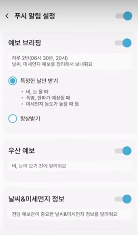 5. 케이웨더 앱은 기상청처럼 강수량과 태풍, 폭염 같은 알림을 보내주는데 차별점은 내가 원하는 정보만 골라서 알림을 설정할 수 있다는 점이에요. 꼭 필요한 소식만 받아볼 수 있어요.