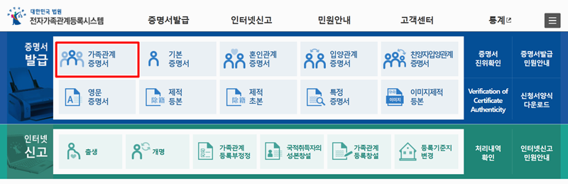 1. 가족관계증명서나 기본증명서를 발급하면 자연스럽게 등록기준지를 확인할 수 있습니다. 처음 화면 왼쪽 위쪽을 보면 가족관계증명서 메뉴가 보여요. 이 부분을 눌러서 다음 화면으로 넘어가 주시면 됩니다.