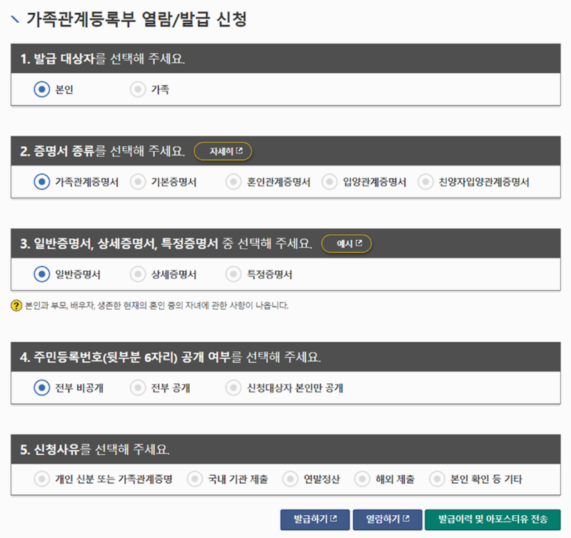 4. 본인 인증을 마쳤다면 이제 발급받고 싶은 서류와 열람 또는 발급 여부를 선택하는 과정이 이어집니다. 원하는 내용을 모두 선택한 다음 발급 또는 열람을 눌러주시면 돼요.