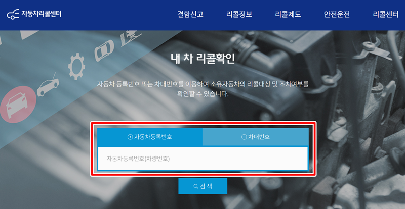 2. 자동차리콜센터 메인 화면으로 들어가면 자동차등록번호 또는 차대번호를 입력할 수 있는 곳이 나옵니다. 여기서 본인 차량 정보를 정확하게 입력하고 검색을 누르면 결과를 바로 확인할 수 있어 편리합니다.