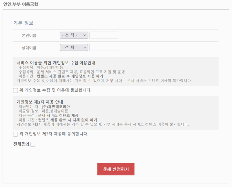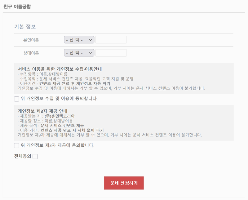 6. 네이트에서 연인이나 부부 이름 궁합을 보거나 친구 이름 궁합을 확인하려면 이름을 입력하고 운세 신청을 해야 합니다. 다만 네이트의 경우 회원 가입 후 로그인이 필요하기 때문에 미리 확인해두는 것이 좋습니다.