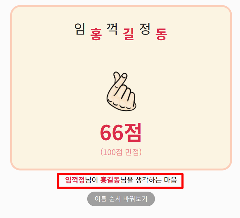 2. 예시로 홍길동과 임꺽정을 입력해보면 먼저 쓴 사람의 이름 기준으로 상대방이 자신을 어떻게 생각하는지 확인할 수 있어 색다른 재미를 줍니다. 이름만 바꿨을 뿐인데도 결과가 달라지는 게 의외로 흥미롭게 다가올 때가 있습니다.