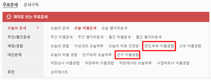 5. 다양한 운세 중 연인과 부부 궁합 또는 친구 관계를 볼 수 있는 이름 궁합도 선택할 수 있습니다. 이름 궁합 외에도 다양한 무료 운세가 함께 있으니 재미로 한 번쯤 해보는 것도 괜찮습니다.