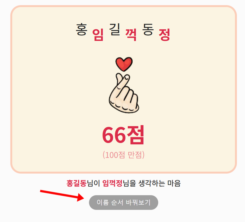 3. 이름 순서를 바꿔서 테스트하면 결과가 또 달라져서 조금 더 다양하게 즐길 수 있습니다. 단순한 이름 조합이지만 결과를 바꿔보며 상황을 다르게 상상해보는 것도 꽤 흥미로운 경험이 됩니다.