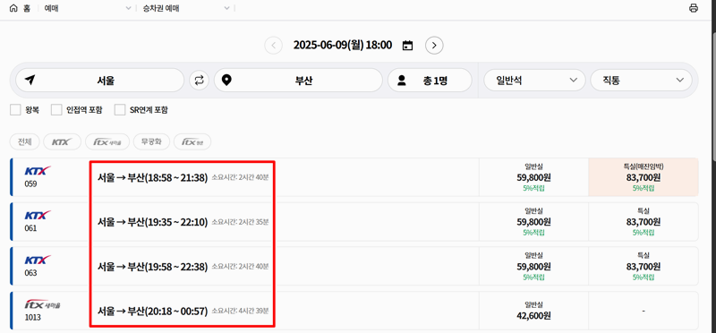 2. 시간대별로 정리된 열차 목록에서 출발 시각과 도착 시각을 비교하며 일정에 맞는 열차를 쉽게 선택할 수 있습니다.