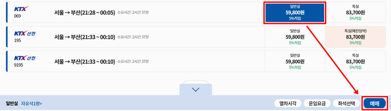 3. 일반실이나 특실 중 원하는 좌석 종류를 고르면 예매로 바로 넘어갈 수 있고 자세한 정보는 하단 메뉴에서 확인 가능합니다.