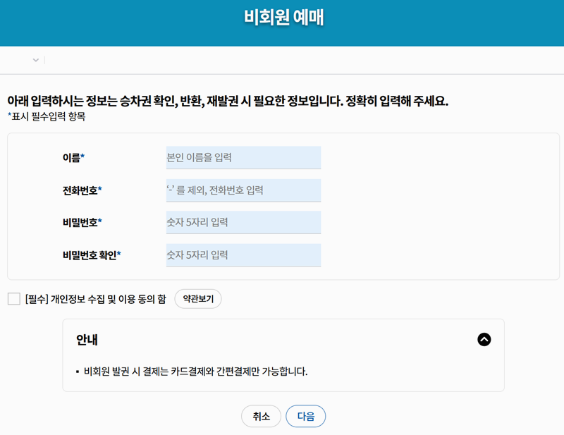 7. 비회원 예매 시 이름, 전화번호, 비밀번호를 입력하면 다음 단계로 넘어갈 수 있고 간편한 결제 방식도 안내돼 부담 없이 이용할 수 있습니다.
