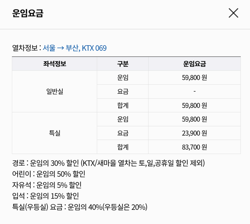 5. 좌석별 요금이 구분돼 있고 경로, 어린이, 자유석 등 다양한 할인 기준도 함께 확인할 수 있어 상황에 맞는 선택이 가능합니다.