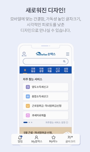 2. 손택스 앱은 새롭게 개선된 디자인으로 깔끔함과 함께 가독성이 높아졌고, 모바일 환경에 맞춘 화면 배치로 편안하게 이용할 수 있습니다.