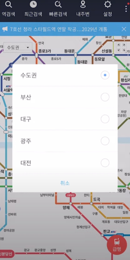 3. 수도권뿐 아니라 부산, 대구, 광주, 대전 등 다양한 지역을 선택해서 각각의 지하철 정보로 바꿔볼 수 있습니다.