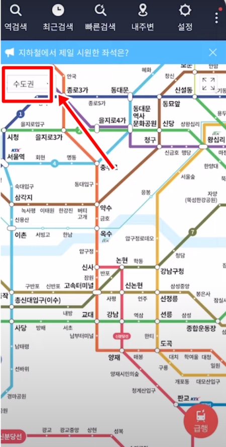 2. 앱을 실행하면 노선도가 먼저 나타나고, 상단에서 지역을 선택할 수 있어 자신이 있는 지역의 지하철 정보를 확인할 수 있습니다.