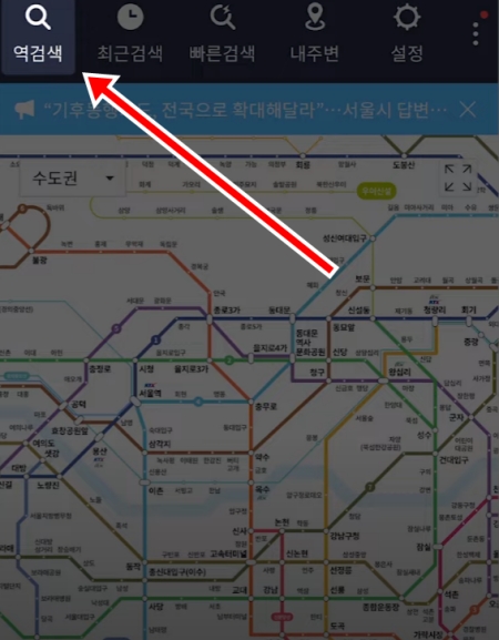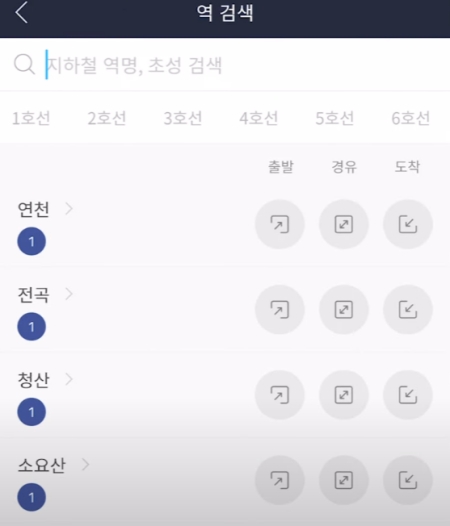 4. 원하는 역이 있다면 상단의 '역 검색' 기능을 통해 빠르게 찾아볼 수 있으며, 최근 검색했던 역도 쉽게 확인 가능합니다.