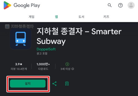 1. 구글 플레이스토어에서 '지하철 종결자' 앱을 찾아 설치할 수 있습니다. 초록색 설치 박스를 누르면 바로 내려받기가 시작됩니다.