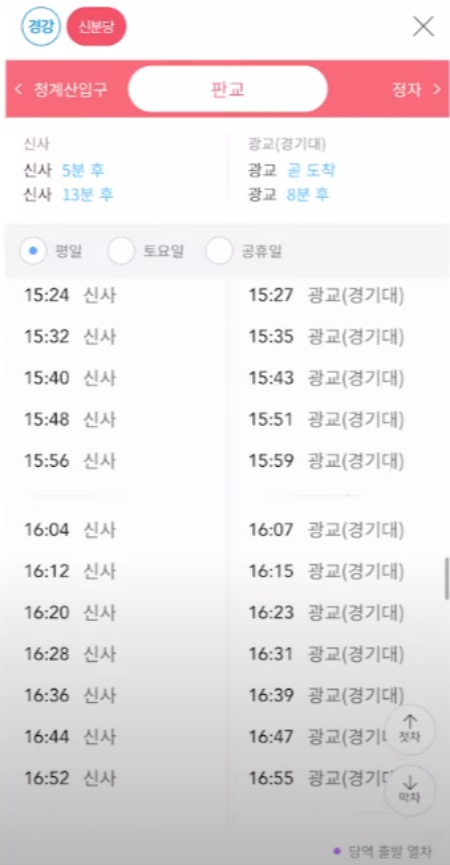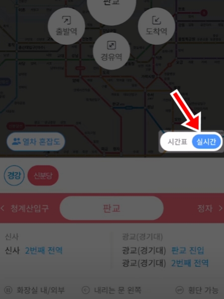 7. 실시간 도착 정보를 확인하고 싶다면, 오른쪽 하단의 '실시간' 탭을 누르면 열차 위치와 도착 예정 시간까지 바로 확인 가능합니다.