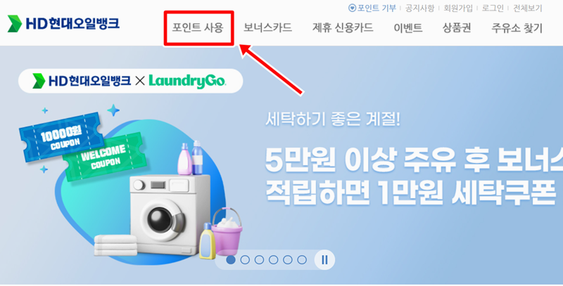 1. 현대오일뱅크 홈페이지에 들어가면 상단에 있는 메뉴에서 포인트 사용을 바로 확인할 수 있어요. 이걸 통해 포인트 관련된 다양한 기능들을 한눈에 찾아볼 수 있게 되어 있어요.