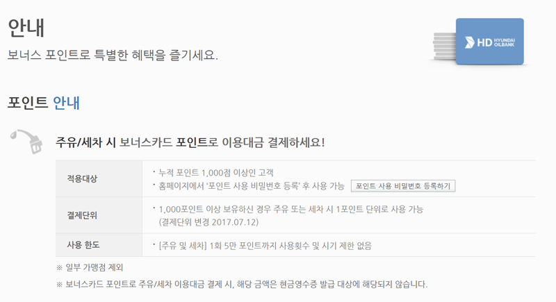 2. 보너스카드 포인트는 1천점 이상부터 사용할 수 있고, 사용 전에 비밀번호 등록을 해두면 주유나 세차할 때 쉽게 쓸 수 있어요. 오프라인 제휴 주유소에서도 사용할 수 있어서 실생활에서 유용하게 쓰여요.