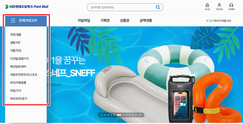 4. 포인트몰에 들어가면 다양한 카테고리 안에서 포인트를 활용할 수 있어요. 제휴된 곳마다 조건이 조금씩 다를 수 있으니 확인하면서 이용하는 게 좋아요. 원하는 제품은 카테고리에서 쉽게 찾아볼 수 있어요.