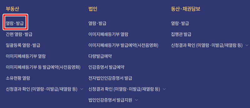 5. 열람·발급 메뉴에서 ‘부동산’ 항목에 들어가면 열람과 발급, 소유현황 조회 등 다양한 신청 메뉴가 나열돼 있어요. 해당 메뉴에서 필요한 항목을 골라 들어가면 돼요.