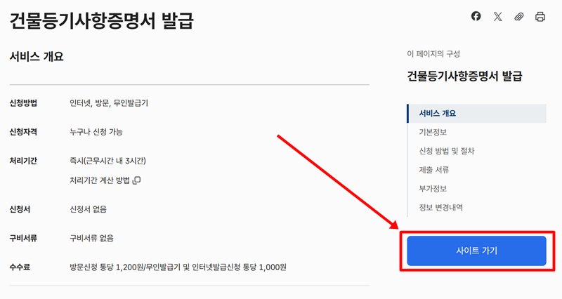 3. 건물등기사항증명서 서비스 개요 페이지로 들어가면 신청 방법, 자격, 처리 기간, 수수료 등이 요약돼 있고, 실제 발급을 위해 ‘사이트 가기’를 누를 수 있게 되어 있어요.