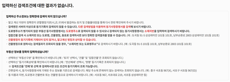 7. 입력한 주소에 따라 검색 결과가 없을 경우의 안내문이 나와요. 정확한 검색을 위해 지번 주소 입력, 도로명 명칭 확인, 명칭 오기 등 다양한 원인을 체크하라고 설명돼 있습니다.