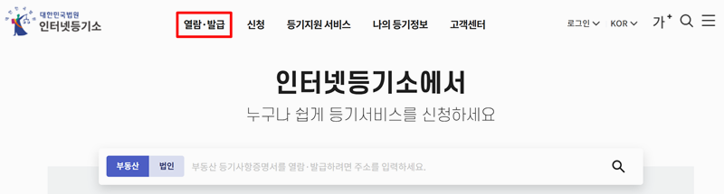 4. ‘사이트 가기’를 통해 이동하면 인터넷등기소 메인 페이지로 연결되며, 상단 메뉴 중 ‘열람·발급’을 통해 등기 정보를 신청할 수 있는 구조예요.