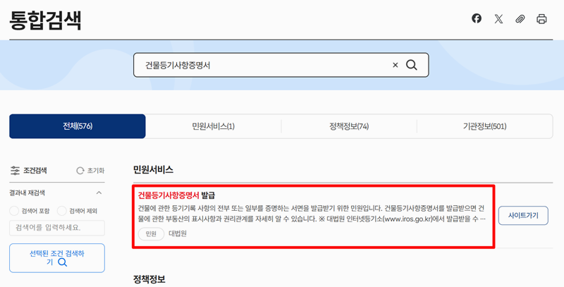 2. 검색 결과 페이지에서 ‘건물등기사항증명서 발급’ 항목이 보이며, 건물에 대한 등기 기록과 권리관계를 확인할 수 있는 민원임을 안내하고 있어요.