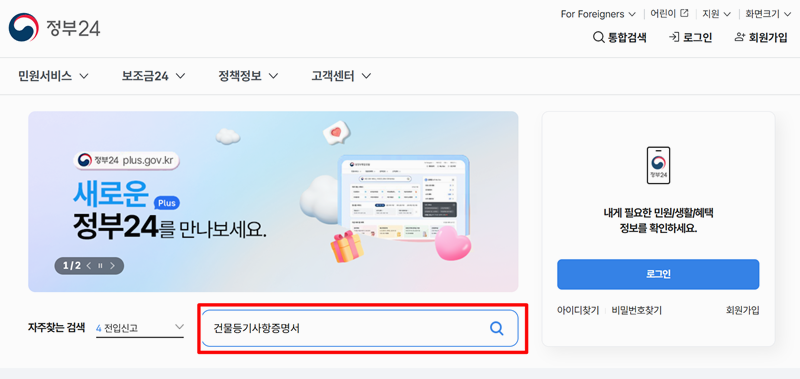 1. 정부24 메인 화면에서 검색창에 ‘건물등기사항증명서’를 입력할 수 있는 칸이 마련돼 있어요. 이곳에서 관련 민원을 찾을 수 있도록 검색 기능이 구성돼 있습니다.