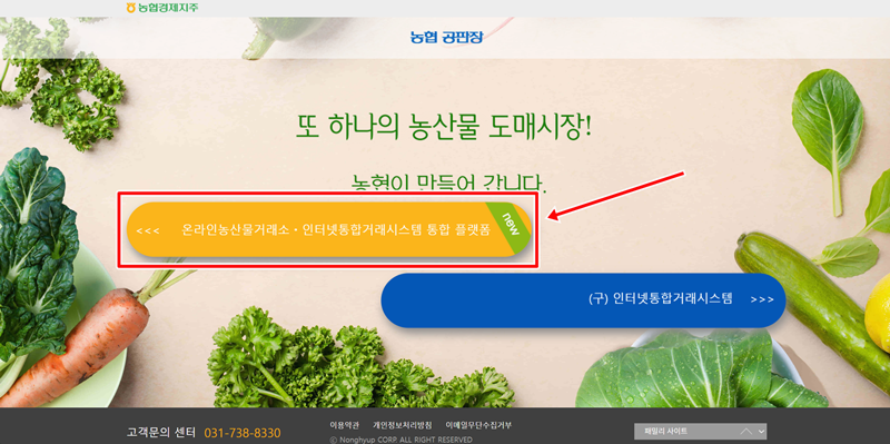 1. 온라인농산물거래소와 인터넷통합거래시스템 통합 플랫폼으로 접속하면, 상단의 온라인농산물거래소가 최신 시스템이라 더 편리하게 다양한 농산물 거래 환경을 누릴 수 있습니다.