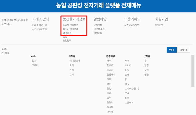 농협 농산물 경매 가격 정보