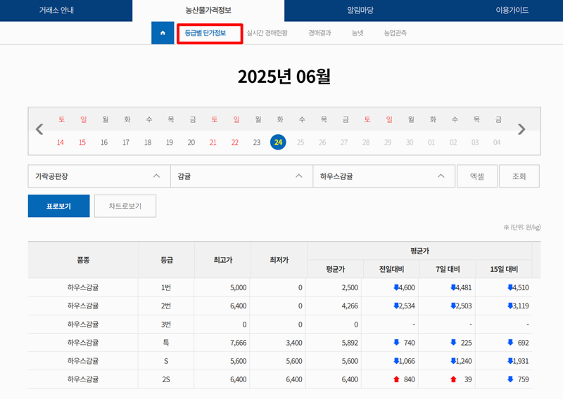 7. 등급별 단가정보 메뉴에서는 농산물의 등급별 최고가, 최저가, 평균가를 확인할 수 있습니다. 전일, 7일, 15일 대비 가격 변동도 함께 볼 수 있어 시세 변화를 한눈에 파악하기 좋습니다.