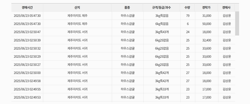 5. 경매 결과 화면에서는 날짜, 공판장, 품목, 품종을 선택해 해당 일자의 상세 거래 내역을 볼 수 있습니다. 산지, 규격, 수량, 경락가, 경매사 정보까지 한눈에 정리되어 거래 흐름을 쉽게 알 수 있습니다.