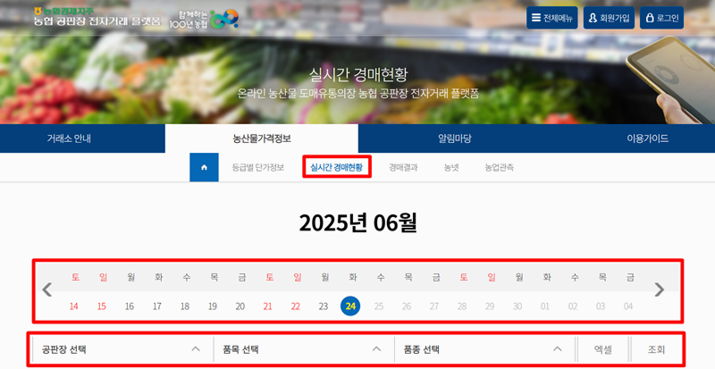 4. 실시간 경매현황에서는 날짜, 공판장, 품목, 품종을 선택해 그 시점의 경매 데이터를 바로 확인할 수 있어 시장 상황을 즉시 파악할 수 있습니다.