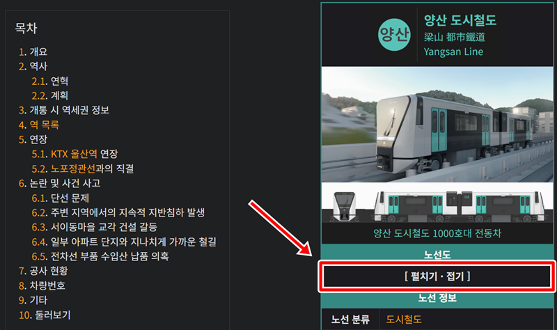 1. 이 곳에서는 양산 지하철에 대한 전반적인 정보를 한눈에 확인할 수 있고, 왼쪽에는 주제별로 정리된 목차가 있어 필요한 내용을 쉽게 찾아볼 수 있어요. 노선도 항목에서는 바로 펼치기나 접기를 통해 노선 구조를 확인할 수 있습니다.
