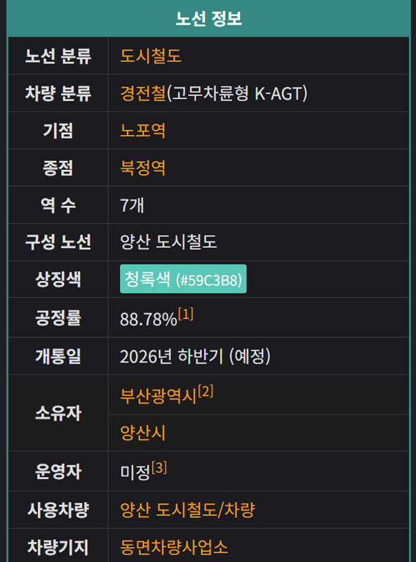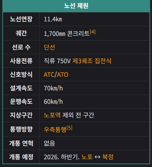 3. 노선 정보에서는 차량 종류가 경전철 방식이고, 기점은 노포역, 종점은 북정역으로 되어 있어요. 전체 역 수는 7개이며, 상징색은 청록색이고, 개통 예정 시기는 2026년 하반기로 잡혀 있어요.