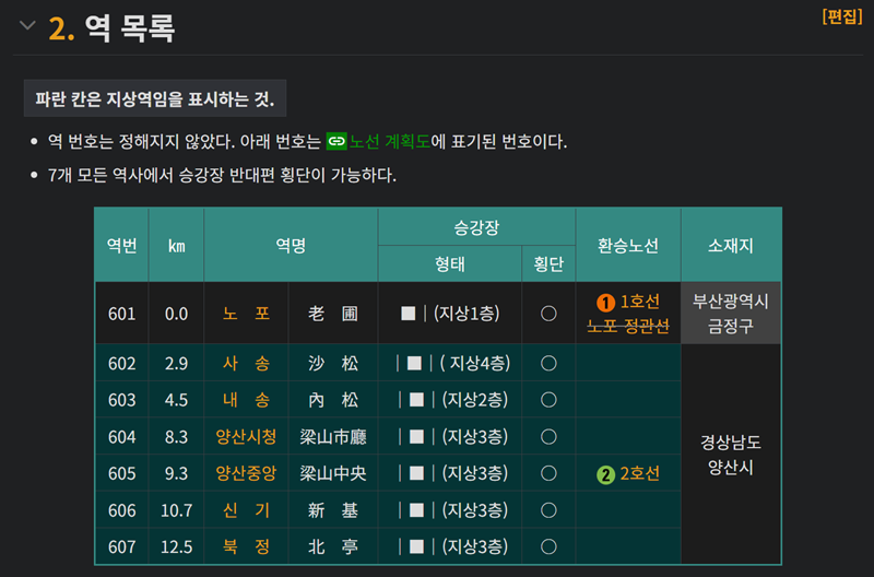 8. 전체 역 목록을 보면 노포에서 출발해 사송, 내송, 양산시청, 양산중앙, 신기, 북정까지 이어지며 대부분 지상구간이에요. 모든 역에서 반대 방향 환승이 가능하도록 구성돼 있어 이용이 편리하게 설계되어 있어요.