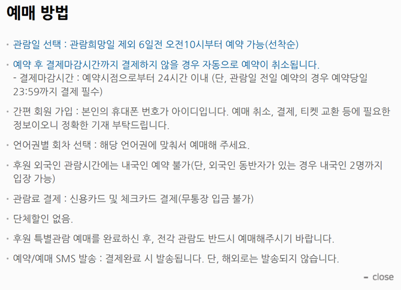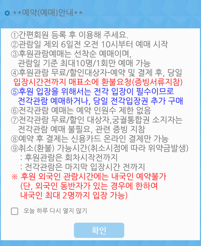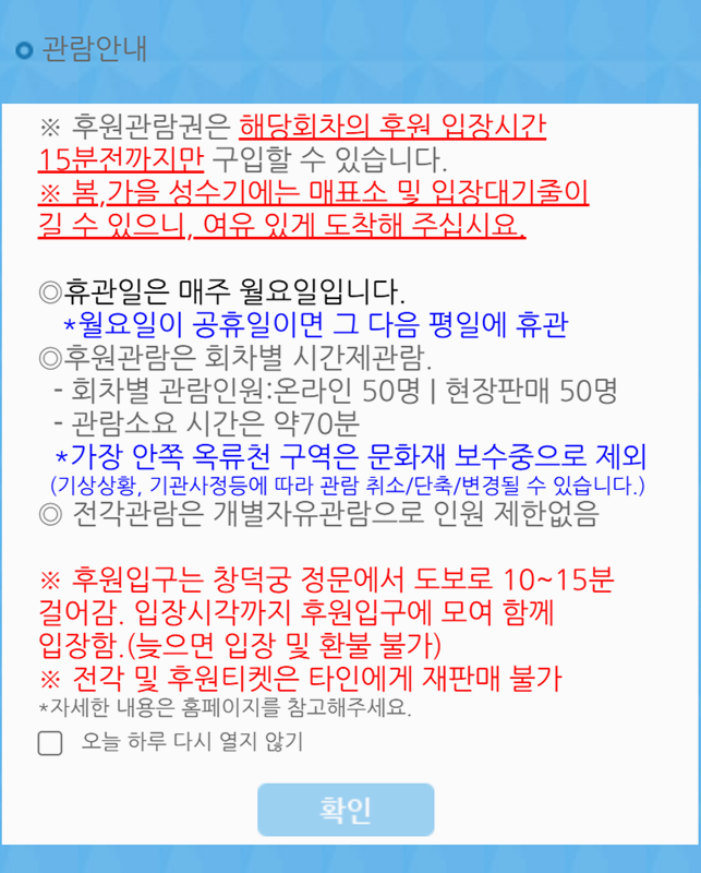 5. 예약 안내 창에서는 예약 가능 시간, 입장 조건, 환불 규정 등 필요한 내용을 확인할 수 있습니다. 특히 후원 입장 시 전각 관람권이 별도로 필요합니다. 후원 관람은 지정 시간 전까지 매표소에서 입장권 수령이 필요하며, 봄·가을에는 대기 시간이 길 수 있으니 여유 있게 도착하는 것이 좋습니다.