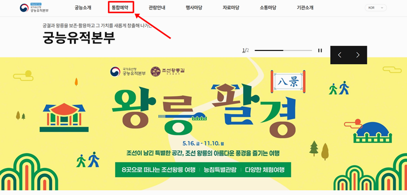 1. 홈페이지 상단 메뉴에서 '통합예약'을 눌러 이동합니다. 이곳에서 궁능 관련 다양한 행사를 한눈에 살펴볼 수 있습니다.