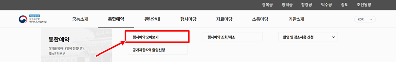 2. 통합예약 페이지로 이동하면 '행사예약 모아보기' 항목이 보입니다. 여기서 원하는 궁궐을 선택할 수 있어요.