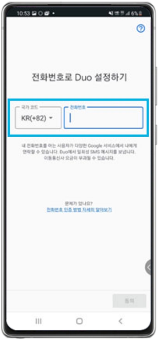 6. 처음 사용할 땐 간단한 설정을 한 번 해줘야 해요. 국가 코드를 선택하고 전화번호를 입력한 다음, 전송된 인증코드를 그대로 입력하면 바로 준비가 끝나요.