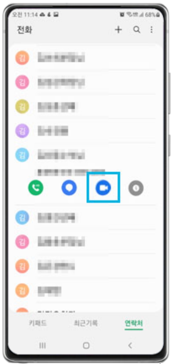 3. 연락처에 저장된 사람에게도 영상통화를 걸 수 있어요. 연락처 목록에서 원하는 이름을 찾은 뒤 파란색 영상통화 아이콘을 눌러주세요.