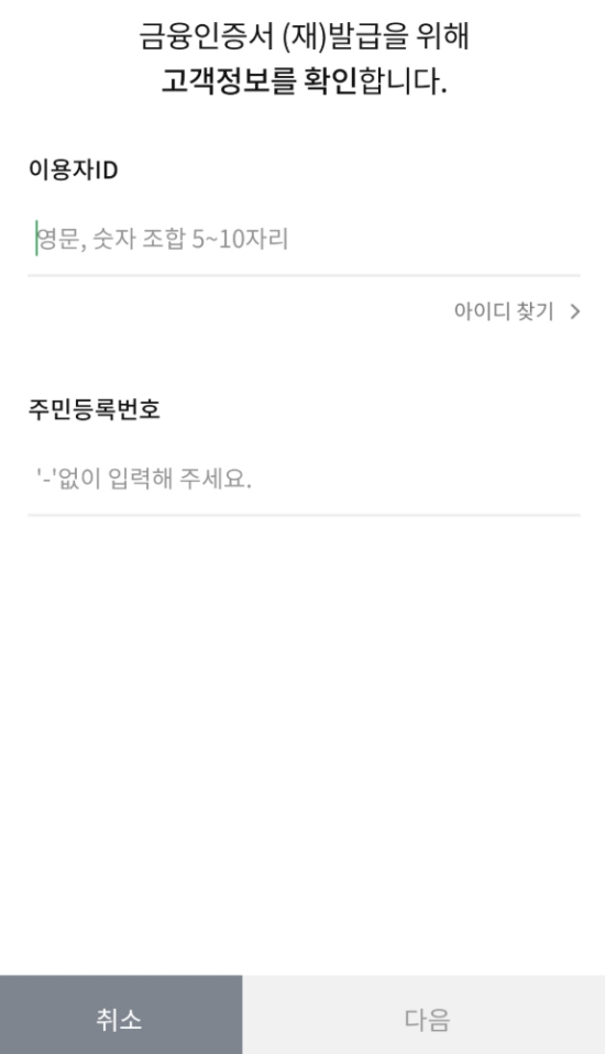 2. 먼저 본인 확인을 위해 사용하시는 아이디와 주민등록번호를 정해진 칸에 '-' 표시 없이 정확하게 입력하고, 아래의 '다음'으로 넘어가 주세요.