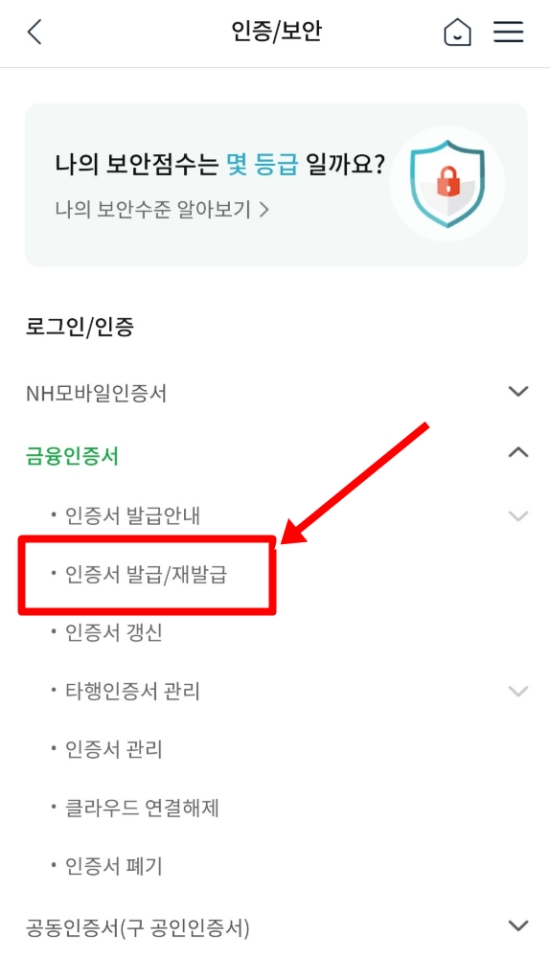 1. NH뱅킹 앱의 인증/보안 메뉴로 들어간 뒤, 여러 인증서 종류 중에서 '금융인증서' 항목을 찾아 '인증서 발급/재발급' 부분을 가볍게 눌러주세요.