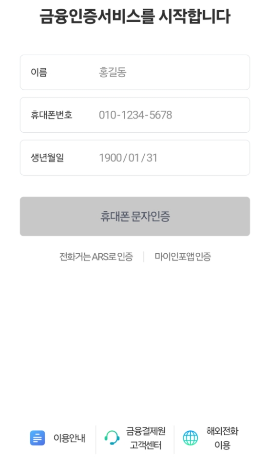 8. 거의 다 왔어요. 마지막으로 이름과 휴대폰 번호, 생년월일을 확인하고 '휴대폰 문자인증'을 진행하면 모든 과정이 마무리되고 인증서가 발급됩니다.